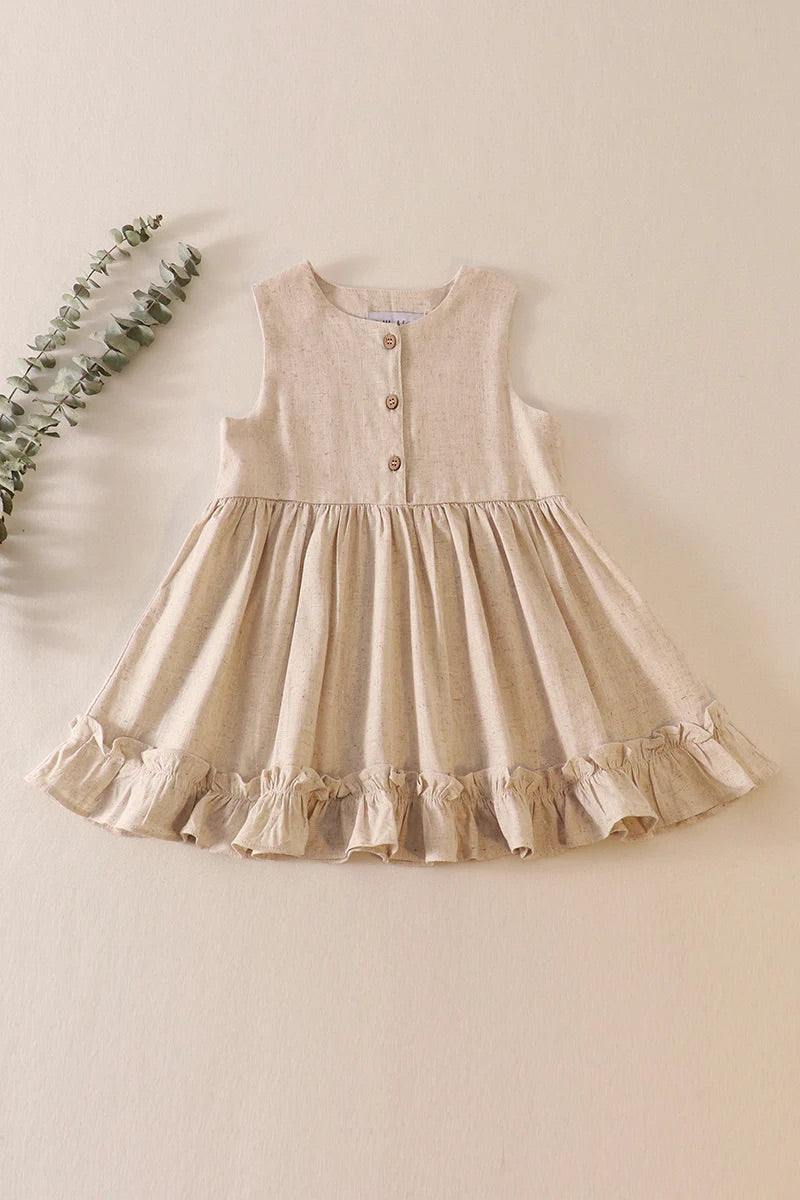 Beige ruffle button linen dress