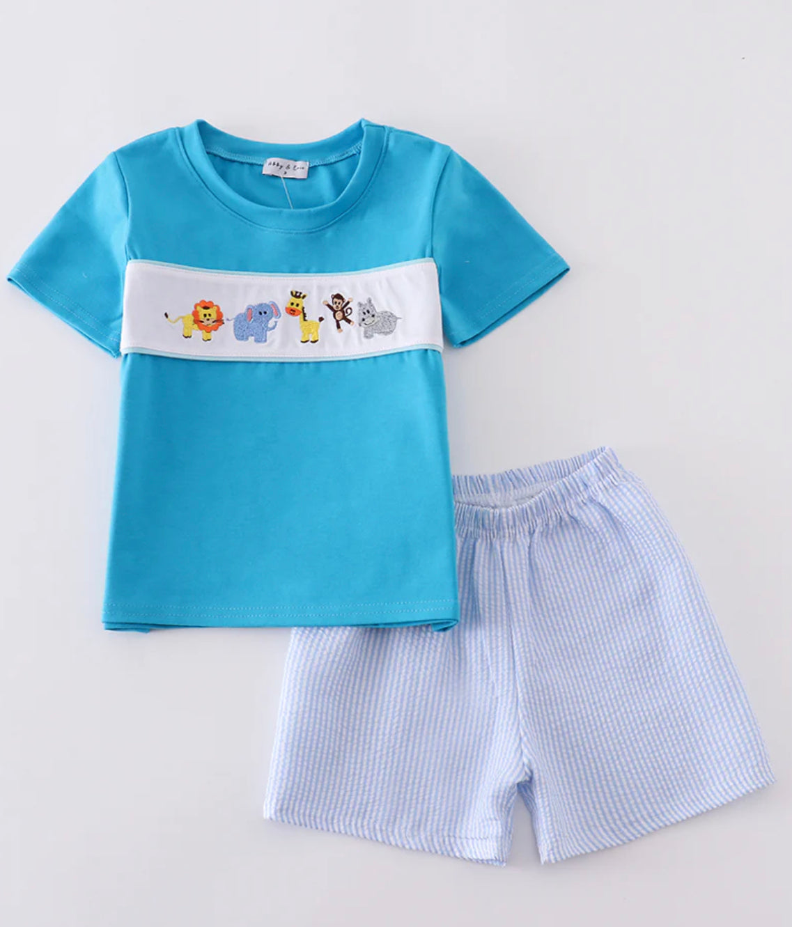 Blue seersucker zoo set
