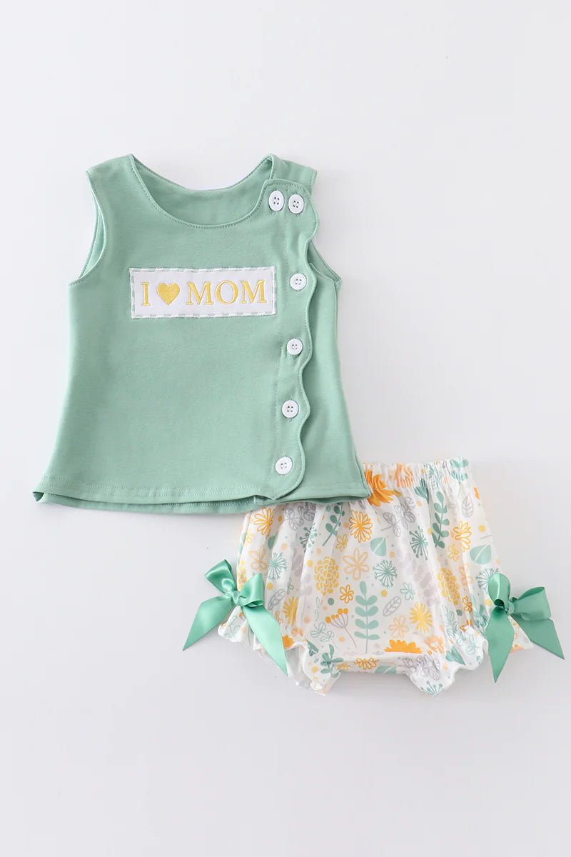 "Show your love for mom in style with our Sage floral print baby set! Adorned with an 'I love mom' embroidery, this set is perfect for your little one's first outings. The delicate floral print adds a touch of charm while keeping your baby comfy and cute. Mom approved!"