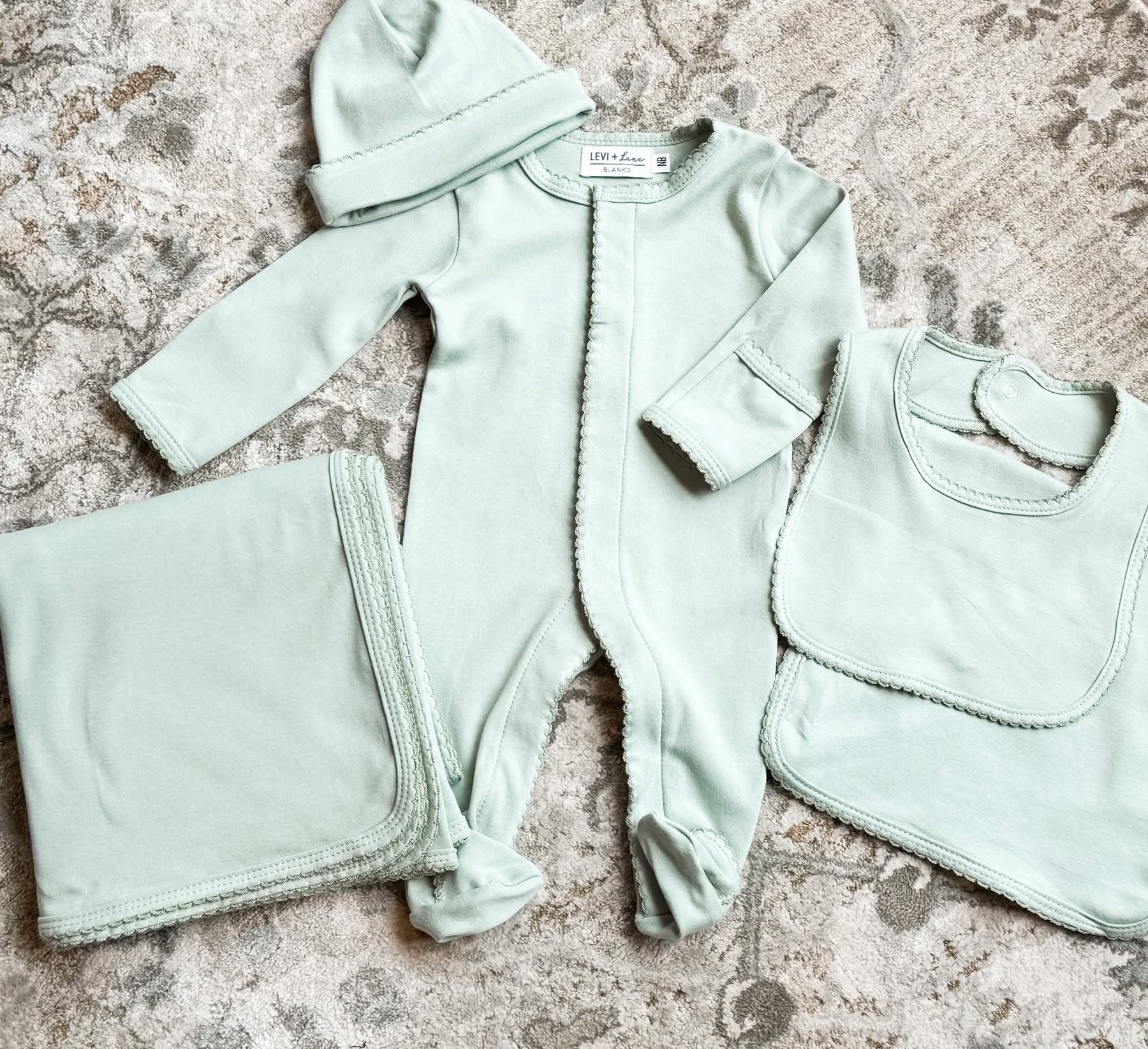 Sage green picot trim bib- INCLUDES EMBROIDERY